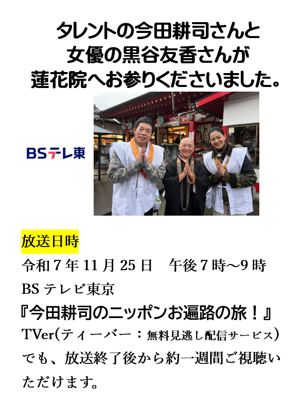 久しぶりにお寺に取材が入り、今田耕司さんと黒谷友香さんをご案内させていただきました。